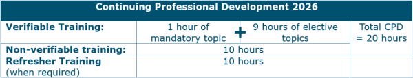 Verifiable training is 10-hours of training delivered by approved training providers. In 2026, the 10 hours are made up of 1 hour of mandatory topics and 9 hours of elective topics.